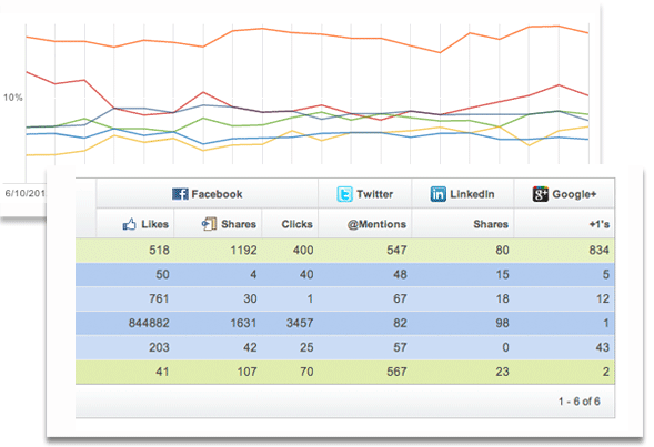 社會(huì)化媒體對(duì)SEO的影響一直在進(jìn)化中,重要的社會(huì)化媒體信息對(duì)于企業(yè)及其競(jìng)爭(zhēng)對(duì)手來(lái)說(shuō),是SEO戰(zhàn)略的一部分。通過(guò)conductor的集成平臺(tái)-SEO云,它會(huì)針對(duì)你和競(jìng)爭(zhēng)對(duì)手的url提供實(shí)時(shí)的社會(huì)化媒體信息。共享SEO和社會(huì)化媒體信息,對(duì)于企業(yè)來(lái)說(shuō),是一個(gè)關(guān)系緊密的線上戰(zhàn)略。Searchlight提供以下社會(huì)化媒體信息:Facebook喜歡,Twitter提述,LinkedIn共享及 Google+的點(diǎn)擊。