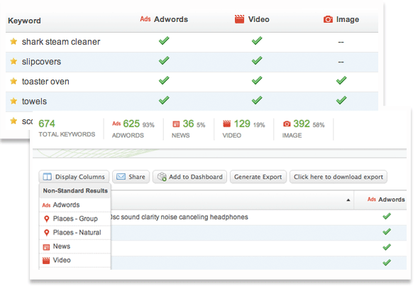 Searchlight通過(guò)自然搜索、競(jìng)價(jià)排名,視頻、圖片及新聞等各個(gè)角度的統(tǒng)計(jì)結(jié)果,進(jìn)行分析。搜索結(jié)果提供了大量的新機(jī)會(huì),以此來(lái)驅(qū)動(dòng)流量和擴(kuò)大客戶量。Searchlight提供你這樣的洞察力,通過(guò)關(guān)鍵詞上的結(jié)果,讓你在不同的結(jié)果類型中有的機(jī)會(huì)或競(jìng)爭(zhēng)力。