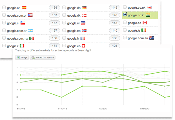 對(duì)于企業(yè)品牌、產(chǎn)品及服務(wù)來(lái)說(shuō),國(guó)際市場(chǎng)提供了這樣一個(gè)新的機(jī)會(huì),通過(guò)Searchlight,你可以達(dá)到實(shí)時(shí)的國(guó)際擴(kuò)展。Searchlight支持超過(guò)30個(gè)國(guó)際市場(chǎng)和不同語(yǔ)種,所以你可以方便地監(jiān)測(cè)全球的視角。跨越國(guó)際化搜索引擎,來(lái)跟蹤你的搜索引擎性能和排名,以前是從未有過(guò)的。通過(guò)不同地區(qū)的搜索引擎,創(chuàng)建分類并比較性能,這樣來(lái)觀察同樣的關(guān)鍵詞是如何在不同區(qū)域的搜索引擎上展示的。